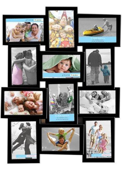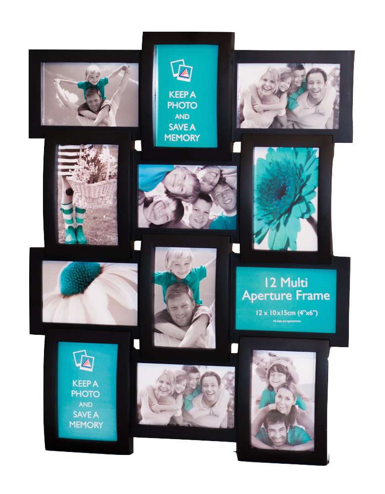 Multi Aperture Picture Frame - Holds 12 Photos, all 6"x4" - Overall Size Approx 59xm x 45cm x 2.5cm - Black in Colour - Can be hung Landscape or Portrait